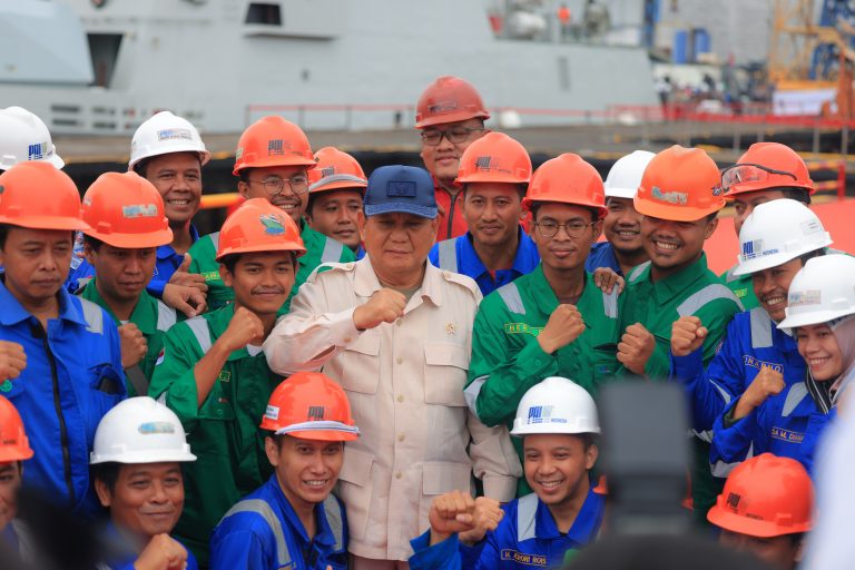 Prabowo menyalami mereka satu per satu. Ia memberi semangat kepada para pekerja untuk selalu bekerja keras membangun PT PAL Indonesia.