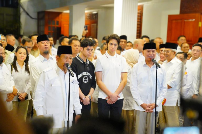 Ketua Umum Partai Gerindra Prabowo Subianto sendiri yang mengumumkan langsung bergabungnya Al Ghazali dan El Rumi, di kediaman Prabowo, di Jalan Kertanegara, Jakarta Selatan, Kamis (27/04/2023)