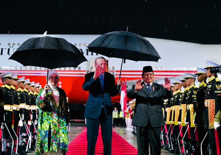 Setibanya di bawah tangga pesawat, Presiden Prabowo menyambut Presiden Erdoğan dengan jabat tangan erat, meski rintik hujan mengguyur Jakarta malam itu. Setelahnya, Presiden Erdoğan bersama Ibu Emine Erdoğan memberi penghormatan kepada bendera Indonesia dan Turki yang dibawa oleh pasukan pembawa bendera.