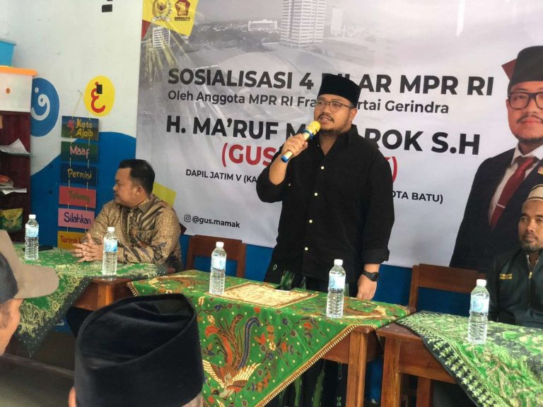 Anggota MPR RI Fraksi Gerindra, H. Maruf Mubarok, S.H., yang akrab disapa Gus Mamak, menggelar sosialisasi Empat Pilar Kebangsaan di Kecamatan Gedangan, Kabupaten Malang, Senin (12/5/2025). Kegiatan ini bertujuan untuk memperkuat karakter kebangsaan masyarakat di tengah derasnya arus informasi digital.